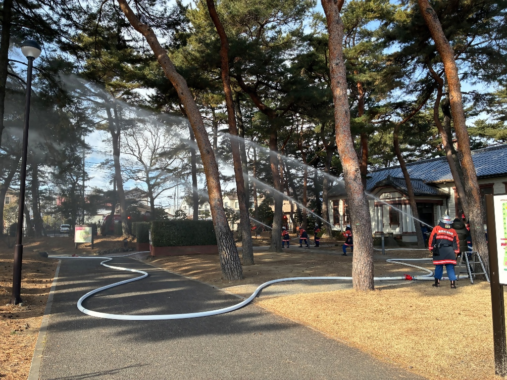 演習には、中央消防署と市消防団、蚕糸記念館担当職員も参加し、火災発生時の通報手順等を確認しました。逃げ遅れた来館者が負傷したことを想定した内容だったため、隊員の皆さんの消火・救助活動の様子から、緊張感が伝わってくる訓練でした。