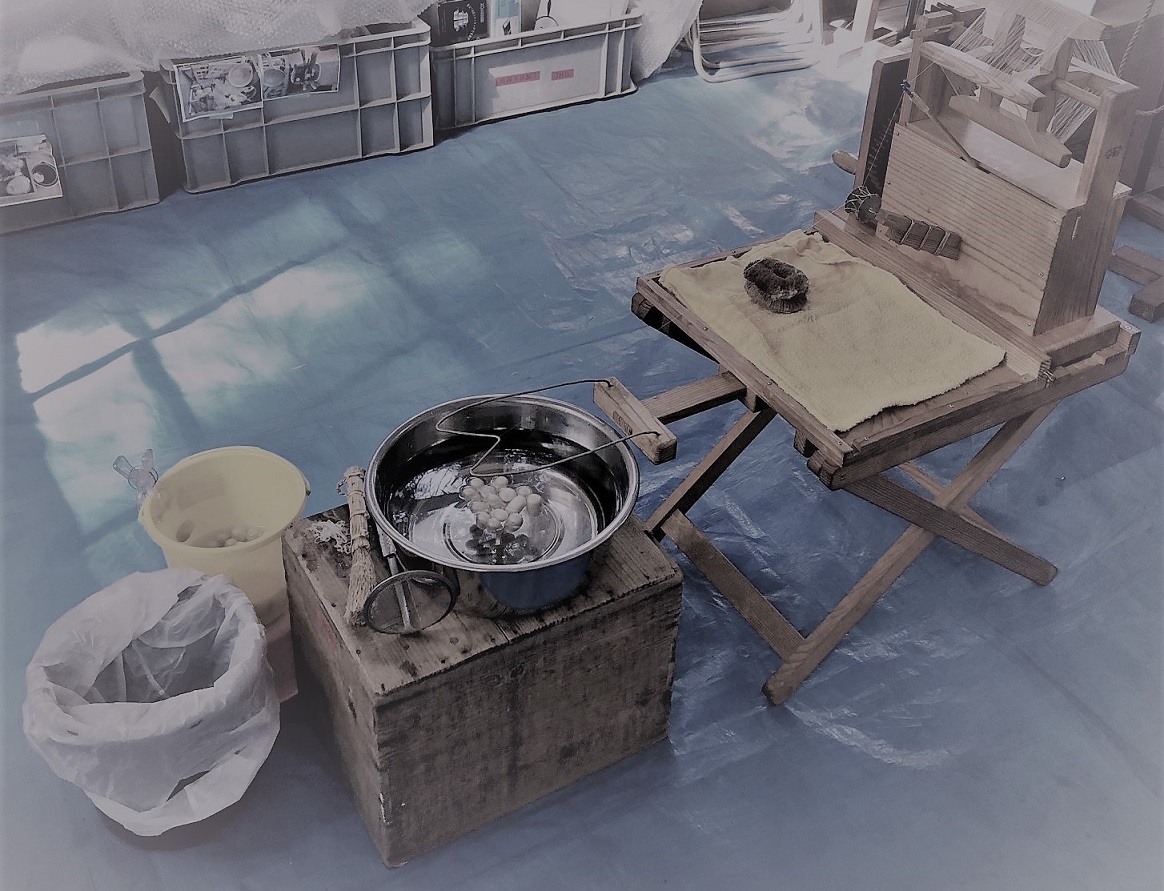 ①座繰体験…座繰り器を使って、鍋で煮た繭から糸を巻き取ります。巻き取った糸は、持ち帰れます!