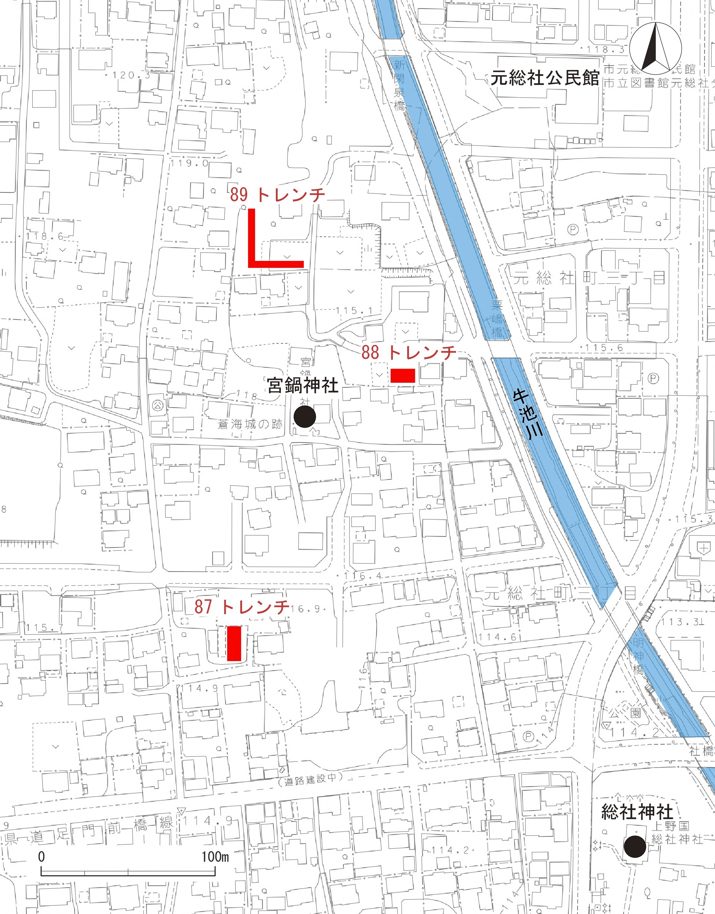 宮鍋神社の北東、現在の牛池川に近い場所に設定したトレンチ(調査区)です。