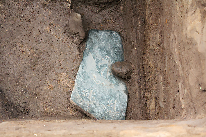 板碑出土状況。中央に阿弥陀如来、下に勢至菩薩と観世音菩薩をそれぞれ表す梵字が刻まれています。(東から撮影)