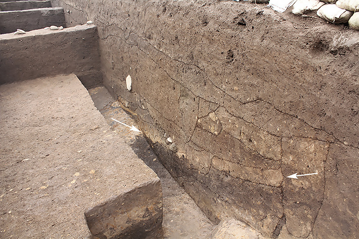 井戸内の土層堆積の様子です。白矢印で示した砂層が軽石層です。(南から撮影)