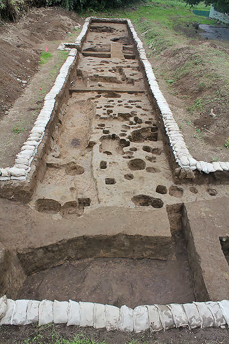 南北方向全景。手前から中央部にかけて多くのピットが、奥に大型の井戸跡が確認されました。(南から撮影)