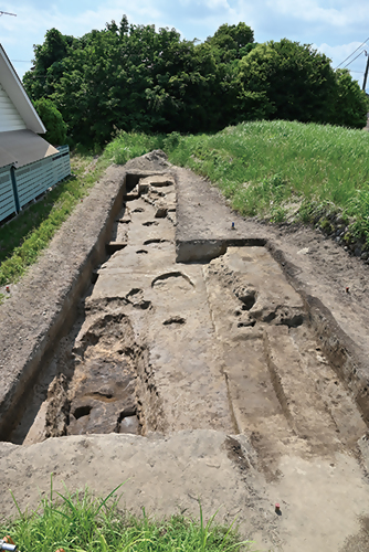 このW-1号溝跡の性格は現時点では不明ですが、溝が牛池川の方向に向かっていることや通水の痕跡から、川を介した水運に関わる施設だった可能性も考えられます。
