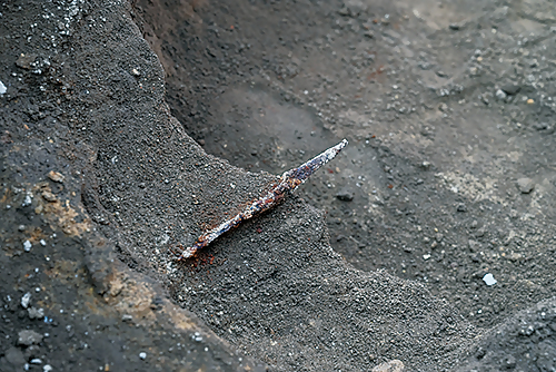 調査区の北端では、蒼海城の堀と考えられる大型の溝(W-1号溝跡)が東西方向に走っていることが確認できました。この溝の中からは、鉄製のヤジリ(鉄鏃)が完全な形で出土しました。この鉄鏃は中世のものと考えられ、蒼海城が機能していたころに使われたものかもしれません。