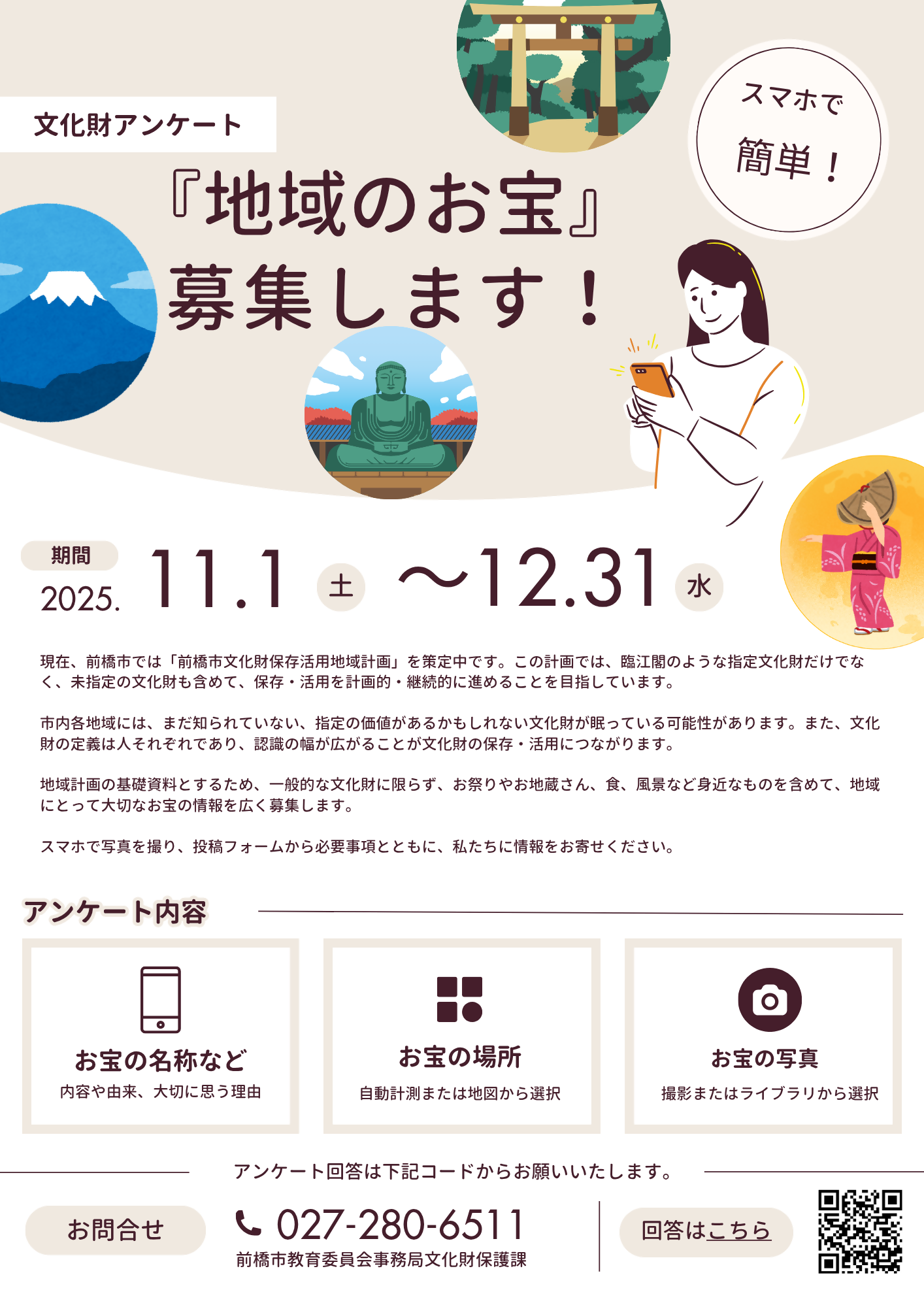 地域計画の基礎資料とするため、一般的な文化財に限らず、お祭りやお地蔵さん、食、風景など身近なものを含めて、地域にとって大切なお宝の情報を広く募集します。