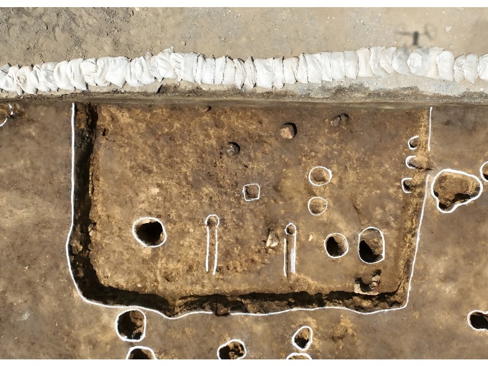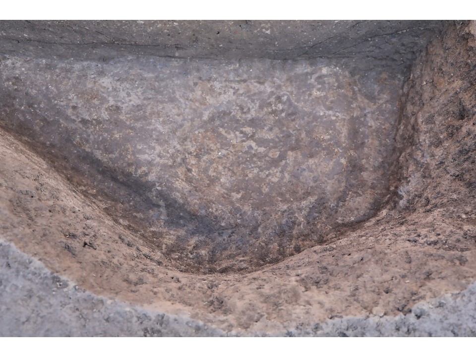 竪穴住居跡などの周溝は、角が丸い四角形であることが多いですが、こちらで検出された周溝は、角度をつけて大きく曲がっています。遺構が調査区の端にあり、道路に隣接していて調査範囲を拡張できなかったことから、画像の状態で調査を終了しました。この部分にどのような機能があったのかは不明です。
