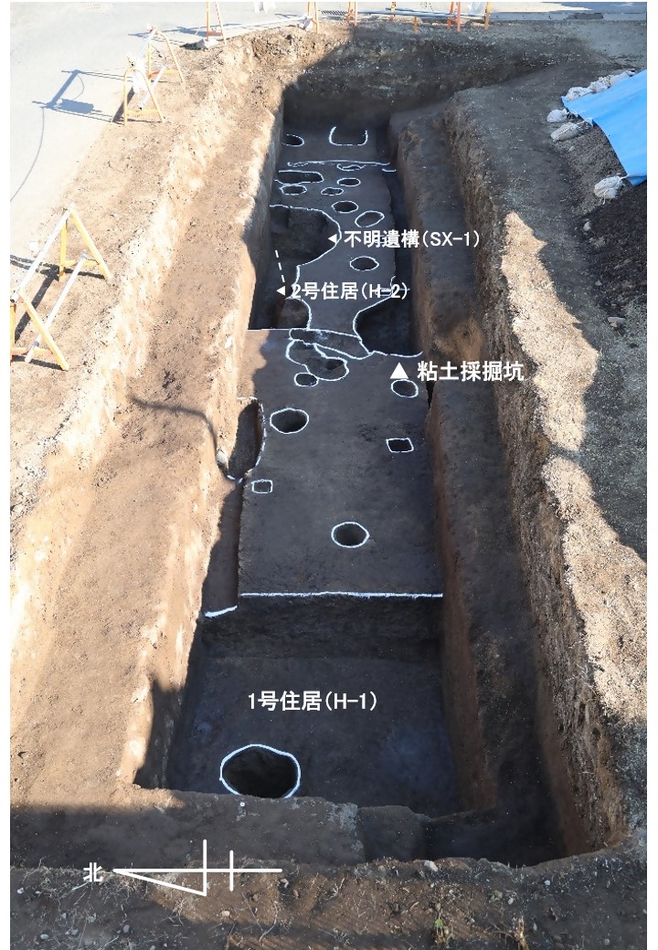 今回の調査区では、竪穴建物跡2軒、土坑11基、ピット(柱穴)19基、溝跡1条、粘土採掘坑1基が検出されました。