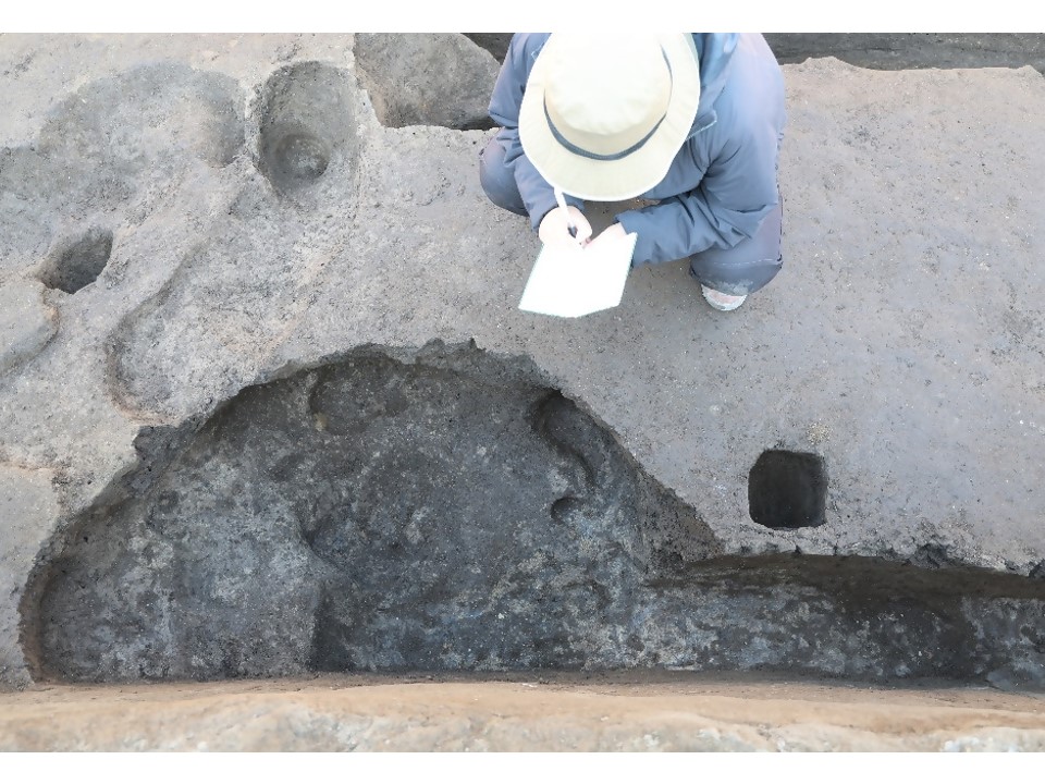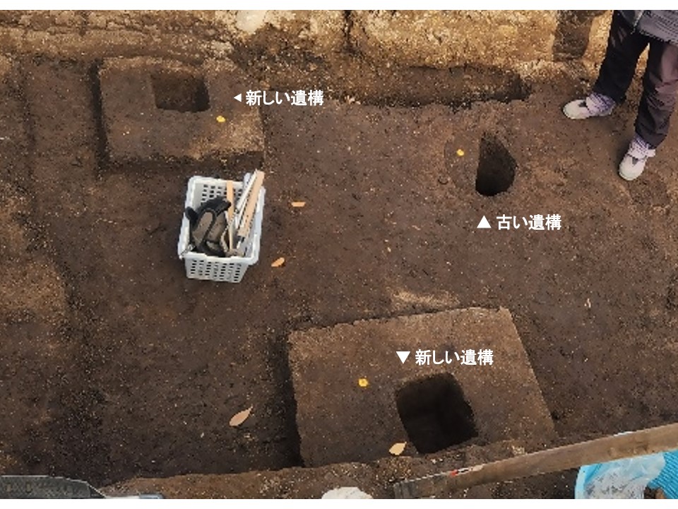 この写真は、検出された「新しい遺構」2基を維持しつつ、下層に古い遺構がないか確認するために周囲を掘り下げた様子です。この際、写真右中央の「古い遺構」が見つかったため、こちらも調査のために掘り下げています。