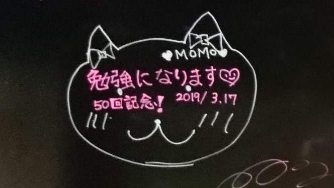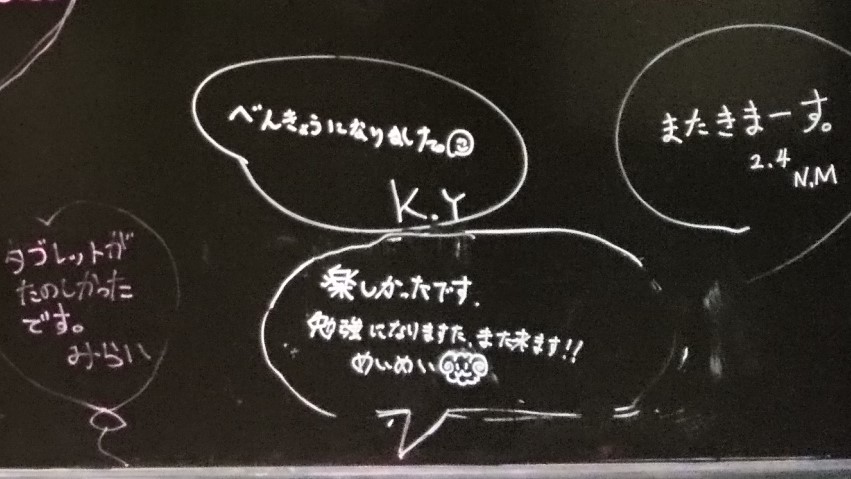 そうそう、展示室の黒板も、ピンクと白のペンで書かれた寄せ書きの花が満開です♪