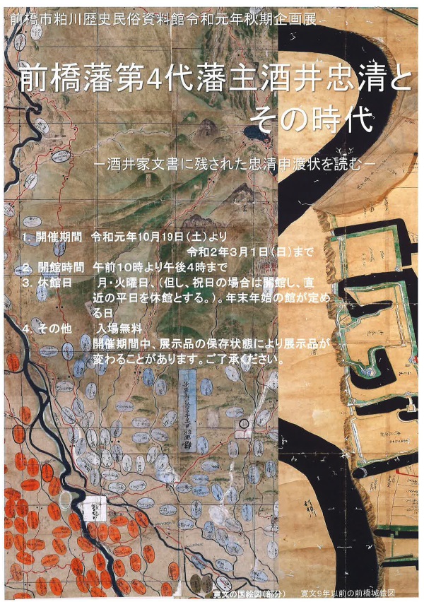 当館では「前橋藩第4代藩主 酒井忠清とその時代」と題し、秋期企画展を開催します。 酒井家文書に残された申渡状を中心に、「下馬将軍」と呼ばれた忠清の素顔に迫ります。 群馬県立博物館所蔵の「伝酒井忠清像」のほか、通常は非公開の資料も多数展示。 是非、お越しください。